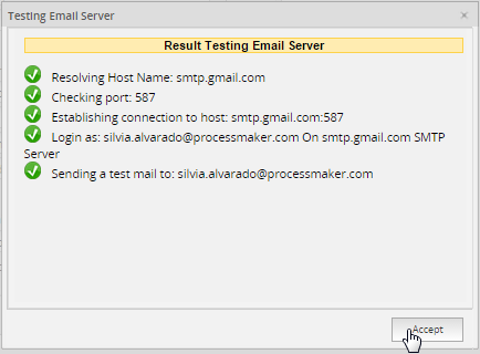 To make sure that ProcessMaker is properly configured to connect to an email server, go to ADMIN > Settings > Email Servers and send a test email as shown in sections above. If ProcessMaker is unable to connect to the email server, check the address, port number and firewall.