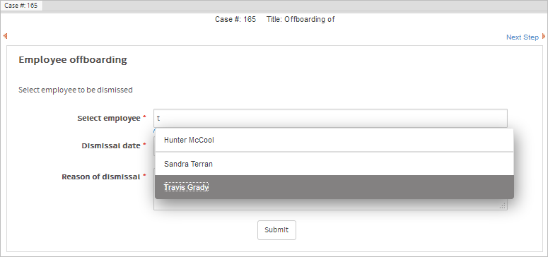 In the Employee Offboarding form that is displayed, Dylan will search for the departing user's name by typing a letter into the Select Employee suggest field. After selecting the employee leaving, he will fill in the dismissal date and the reason why the employee is leaving. Note that the Select Employee field only suggests usernames that have been registered using the Employee Onboarding process and are stored in the Employee Onboarding PM table.