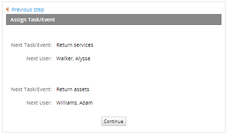 Parallel to the Return Services task is the Return Assets task, which is assigned to a member of the Administration department. In this example, the case was assigned to Adam.
