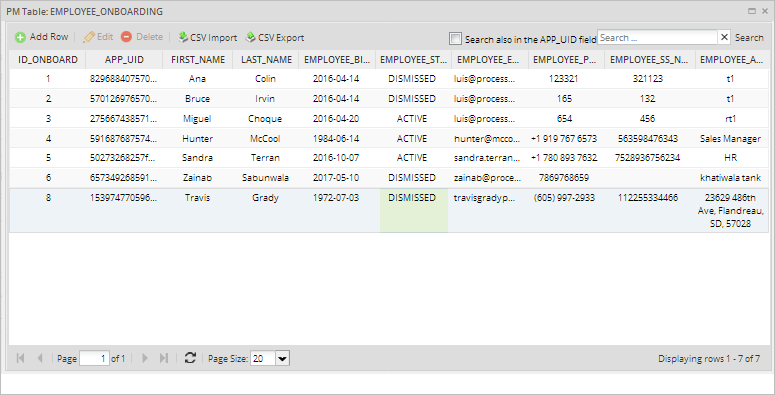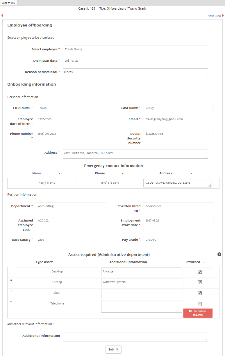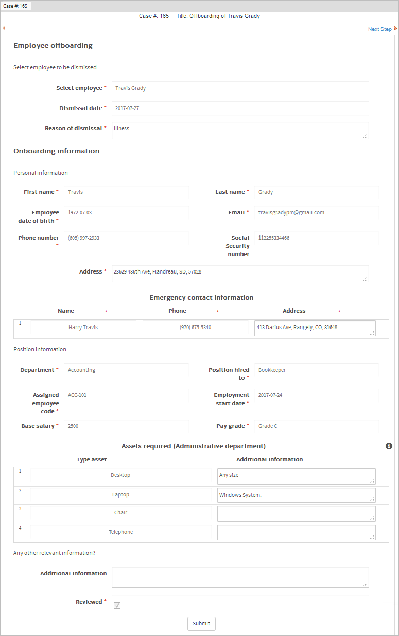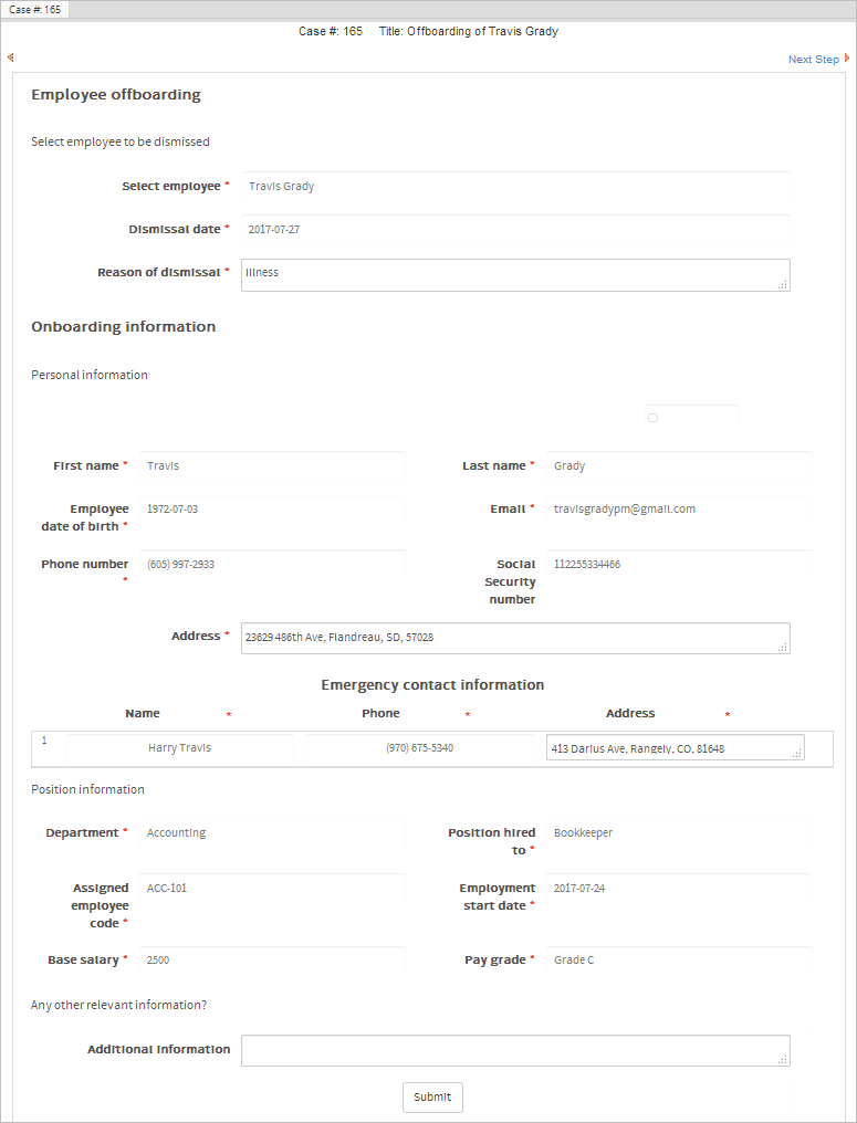 Click on Submit to complete the case. The information stored in the PM table named EMPLOYEE_ONBOARDING will be updated and the status of the departing employee will be changed to "DISMISSED".