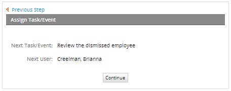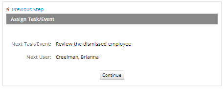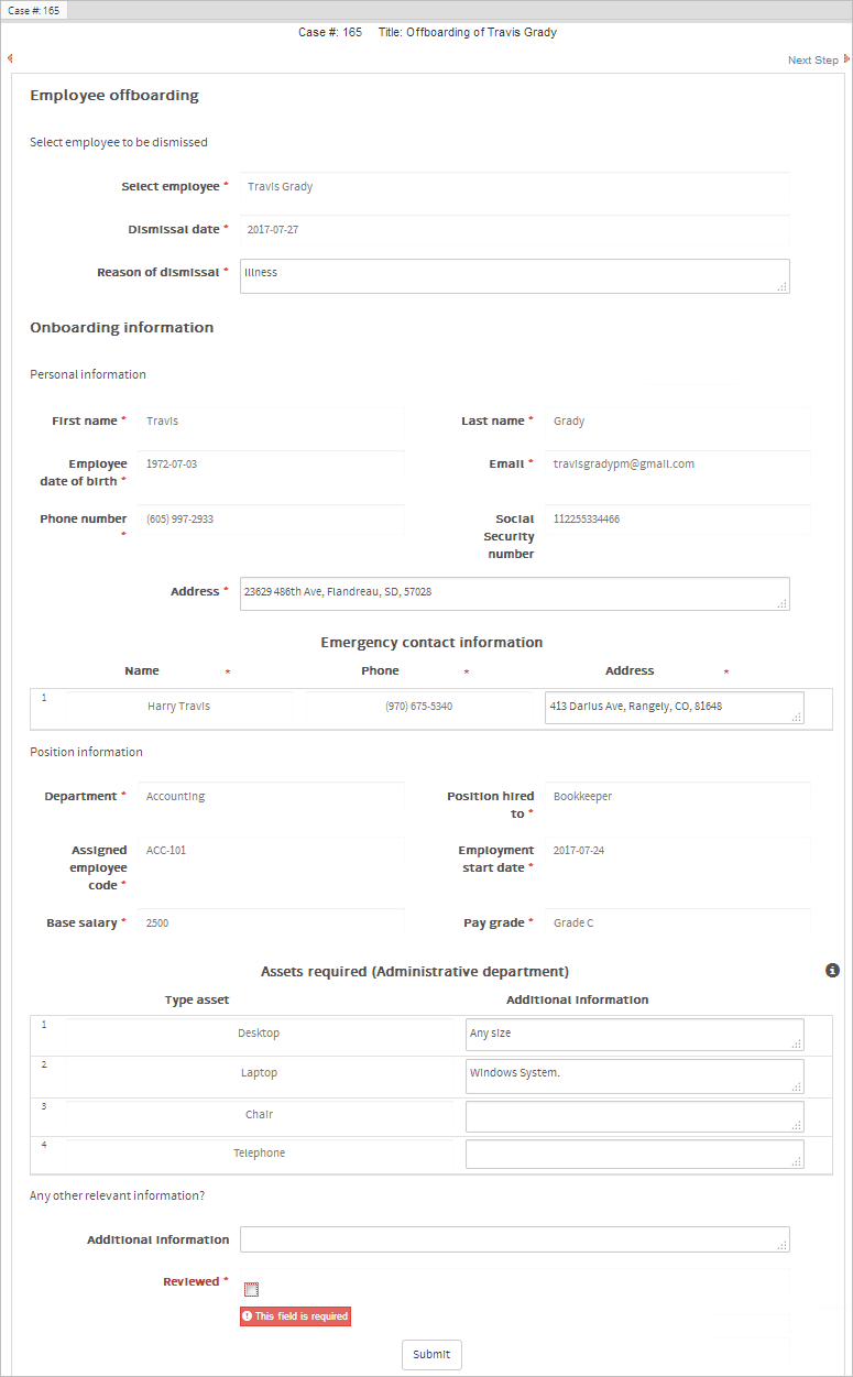 Once the information is reviewed, submit the form and the case will be assigned to the next task, Review the dismissed employee, which is assigned to the employee's manager. In this example, Travis worked in the Accounting department, whose manager is Brianna.