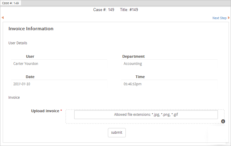 The first task, Receive Invoice, initiates the case with a Dynaform that requires the invoice document to be uploaded in any of the following formats: jpg, png, gif. The User Details section is automatically filled in with information about the user currently logged in. In this example, the user who initiates the case is Carter.