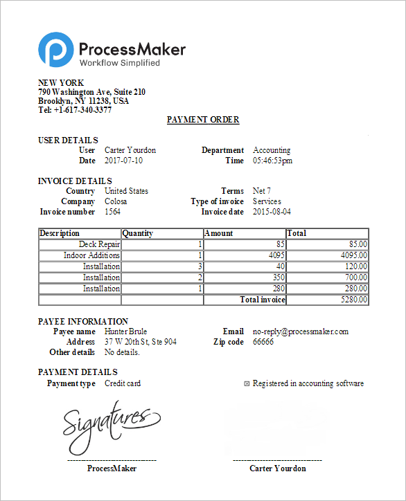 Once the payment details are set and submitted, a document named Payment Order, which contains all the information about the invoice, is generated in PDF format.
