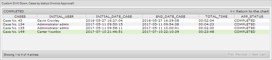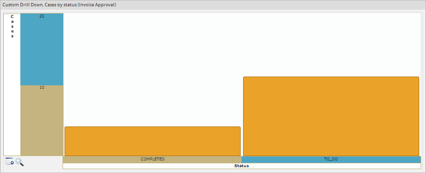 Data about the cases of the Invoice Approval process is shown on the dashboard. The Cases by Status dashboard uses a custom drill down dashboard that groups cases by status. This dashboard has two stages: in the first stage, the dashboard shows the number of cases with To Do and Completed status.