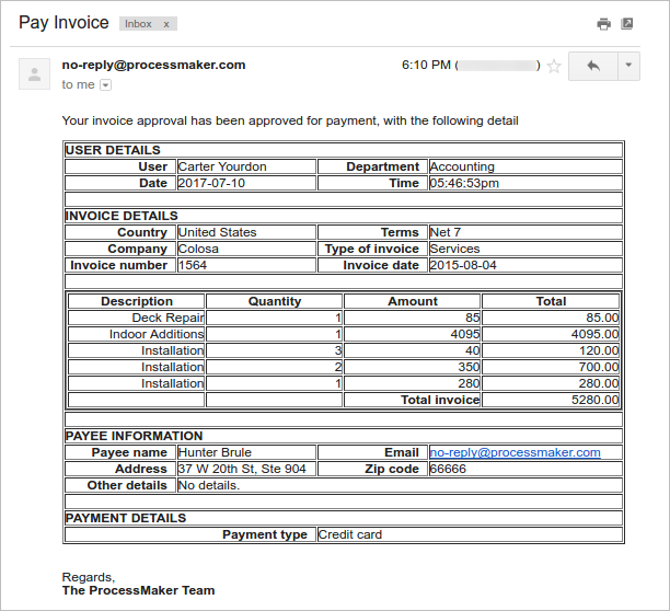 Finally, after routing from the final task, the Payment notification trigger sends an email containing the invoice details to the email address of the user who started the case.