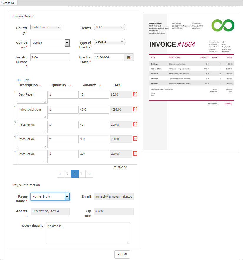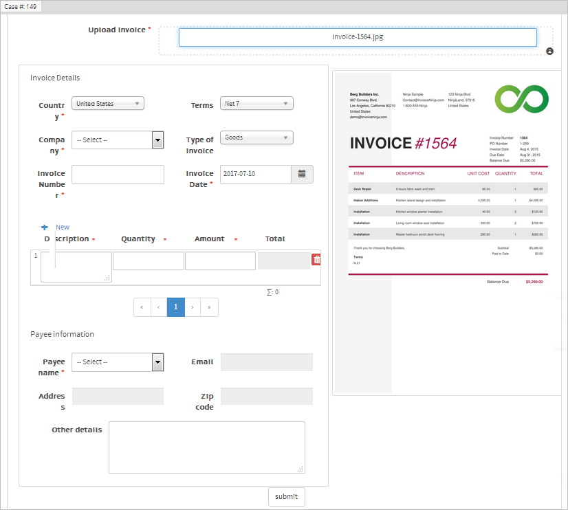 Once the invoice details and payee information are filled in, as shown in the image below, the case will be sent to the department's supervisor.