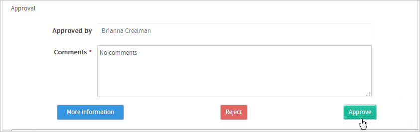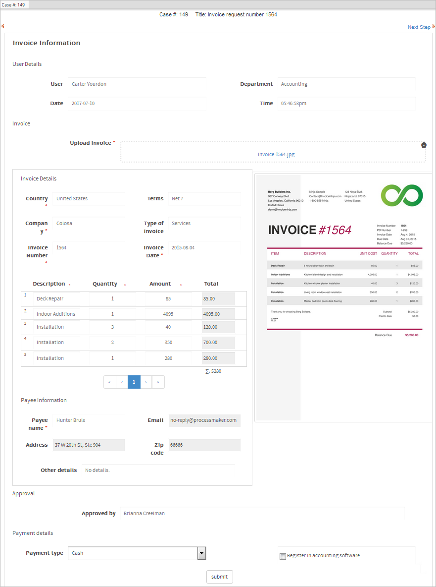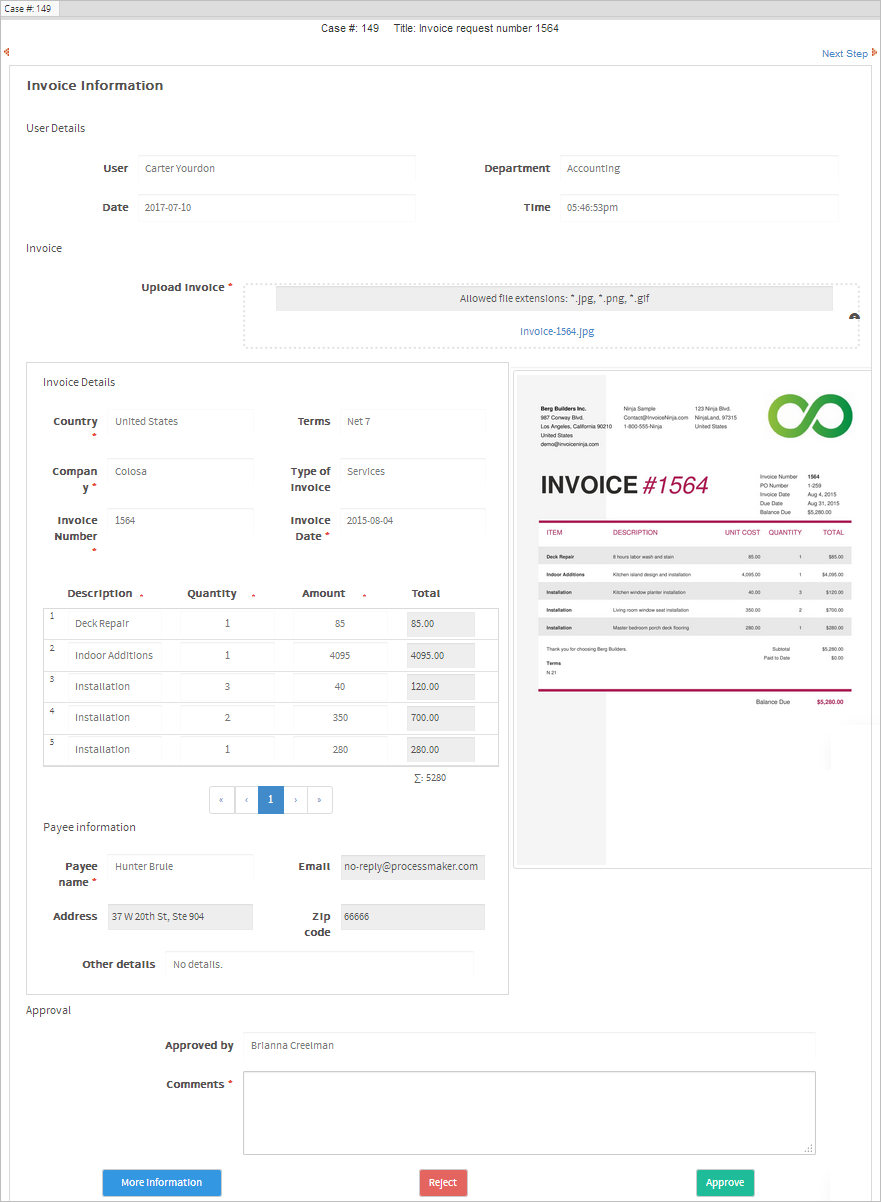 Log in as Brianna and open the case sent by Carter in the task Approve Invoice. The form that opens displays the user details, the invoice details, and the payee information filled in by the user who started the case. The User Details section is automatically filled in with information about the user currently logged in. If the invoice is approved, the case is sent to a user belonging to the Finance department using the cyclical assignment method. In the case the supervisor requests more information, the employee who started the case receives the case again.