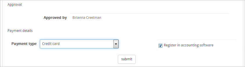 In this example, Ana selects "Credit Card" as the payment type, checks the Register in accounting software option and submits the case.