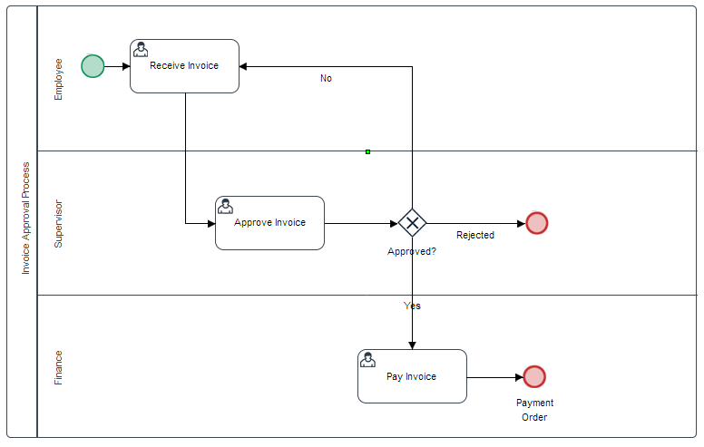 The Invoice Approval process is initiated when an employee attaches an invoice, fills in the invoice details and the payee information. Once this information is set, the case is routed to the employee's supervisor. The supervisor can approve, reject the invoice, or ask for more information. In the case the supervisor rejects the invoice, the case will end and an email notification is sent to the employee. If the details on the invoice are not clear, the supervisor can request more information, and the case will be sent back to the employee who started the case. Once the invoice is approved by the supervisor, the case is assigned to a member of the Finance department, who completes the payment details. Finally, an output document is generated with all the invoice information and is attached to an email notification containing the payment order details that is sent to the employee who started the case.