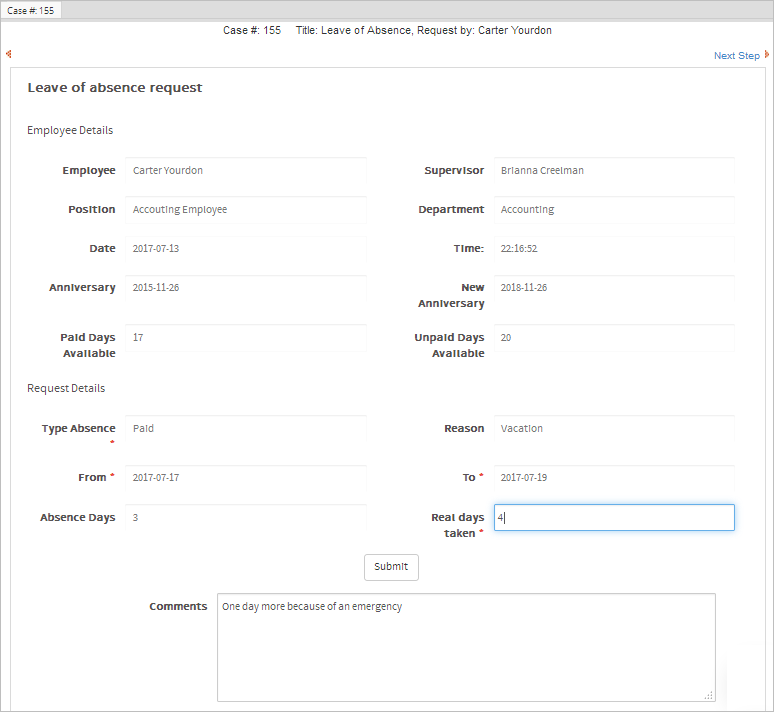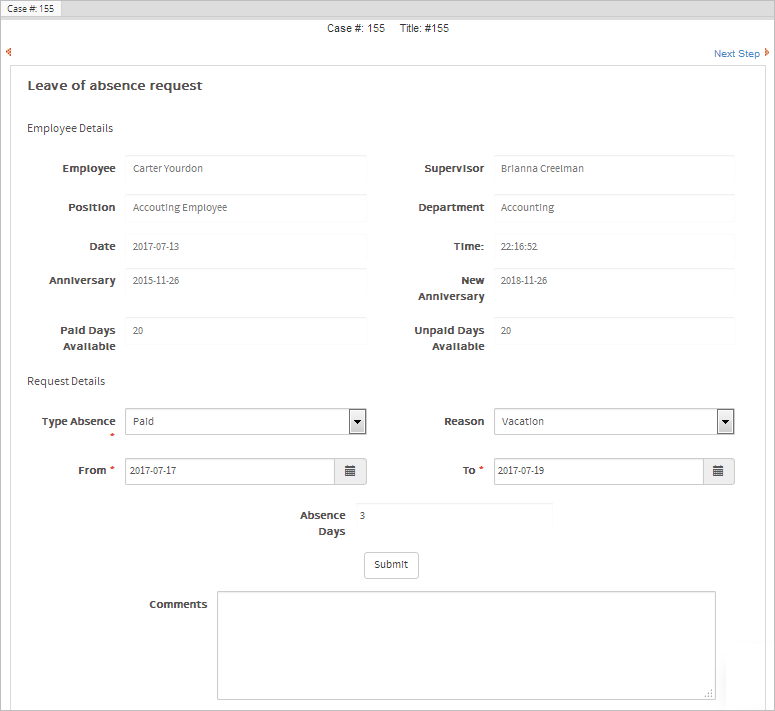 The first task, Request leave of absence, initiates the case with a Dynaform that displays information about the applicant in the first section, including how many unpaid and paid days he/she has available. In the second section, the applicant can select the type and reason of the absence, the start date and end date of the absence period, and write a message to the employee's supervisor. The total number of days of leave will be calculated automatically. In this example, Carter asks for three days of leave, from 2017-07-17 until 2017-07-19, as shown in the image below: