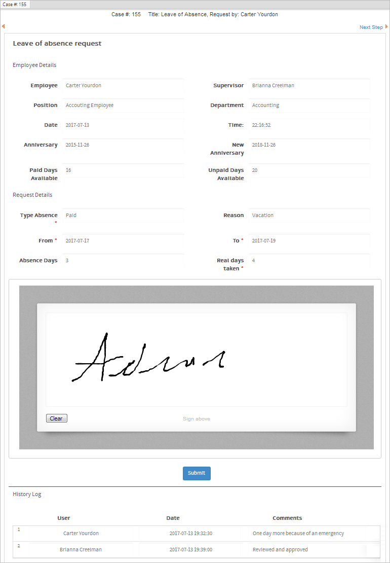 Log in as Brianna and review the new information filled in by Carter. The supervisor can approve or reject the amount entered in the Real days taken field in the History Log section. In this example, Brianna will approve the new information, so she selects "Yes" in the Approve dropdown, fills in a comment and puts her signature in the box under the Approve dropdown.