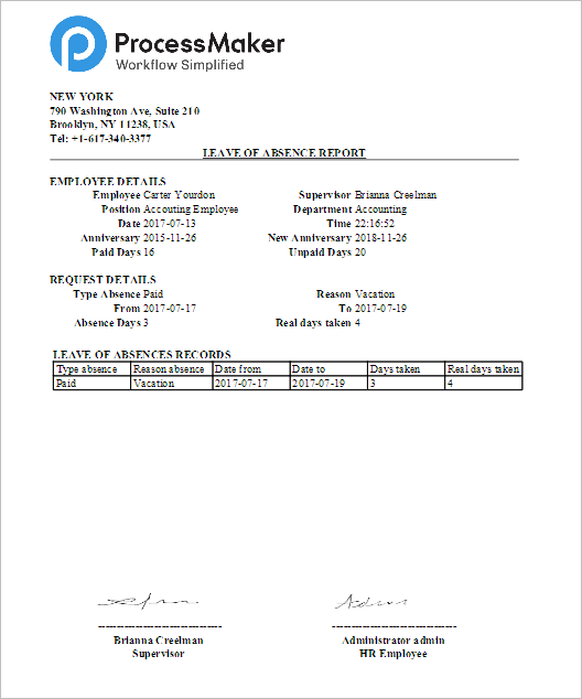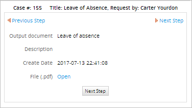 Finally, an output document with the name "Leave of Absence" that contains all the information collected throughout the process will be generated in PDF format.