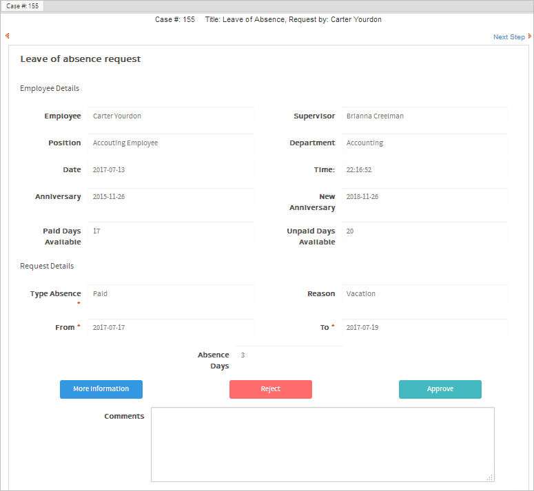 Log in as Brianna and open the case sent by Carter in the Approve Request task. The Dynaform will be divided into two sections: the first section of the Dynaform displays all the information about the applicant in Disabled mode, and the second section shows the type of absence, reason and the start and end dates of the absence. The supervisor, Brianna, can ask for more information, reject or approve the request. The More information button sends the case back to the employee, so he/she can complete or correct the information. The Reject button finishes the case and sends an email notification to the employee. Finally, the Approve button approves the application and sends the case back to the employee, along with an email notification informing the employee that his/her request has been approved and they can leave the office on the requested dates.