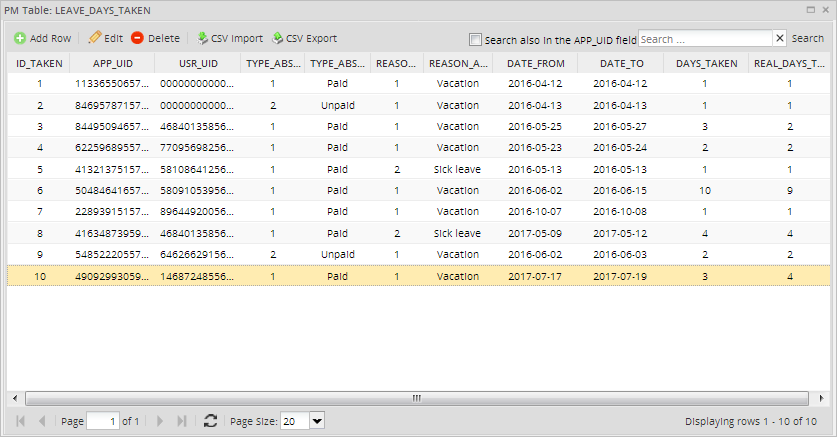 Once the Dynaform is submitted, the information stored in the PMT table named PMT_LEAVE_DAYS_TAKEN will be updated, so the next time the employee opens a request, the system will know how many vacation days the employee has left.