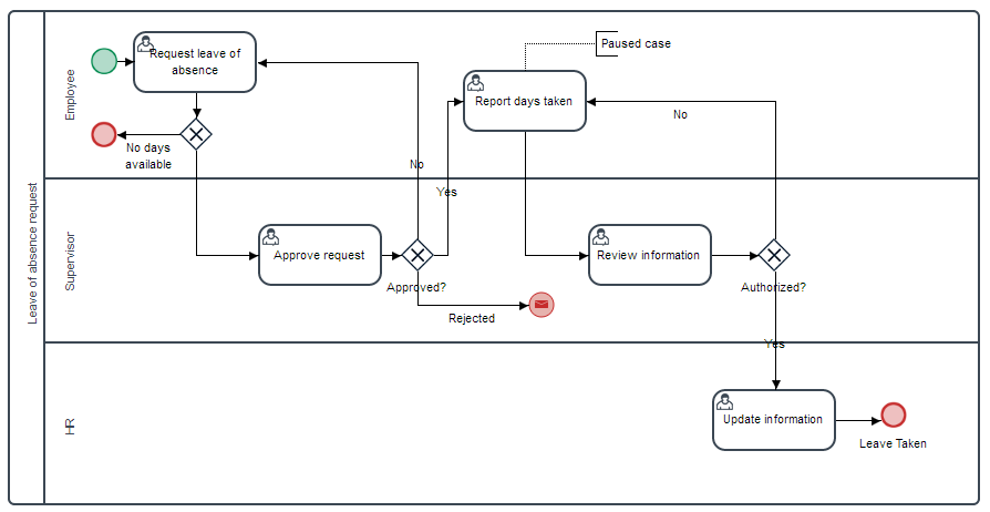 The Leave of Absence Request process is designed to let employees request vacation days, sick leave or business leave and receive approval quickly. Furthermore, this process can also be used to update human resource systems to keep track of paid sick or vacation leave.