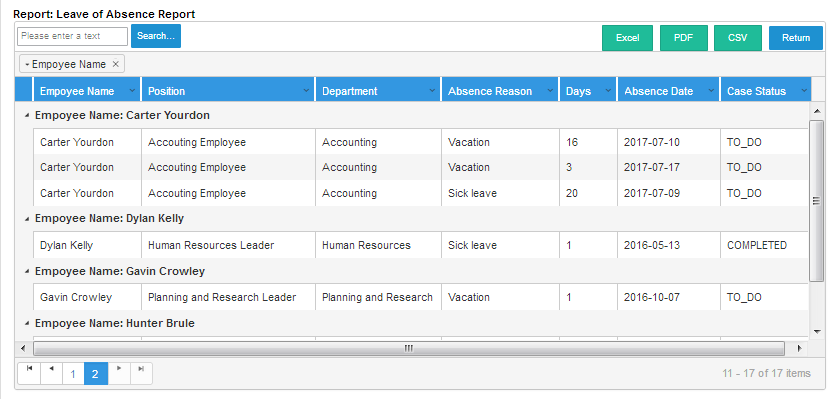 The Leave of Absence report shows all requests that have been completed, requests in draft and requests that are in progress. This report is generated using ProcessMaker's Data Reporting Tools plugin.