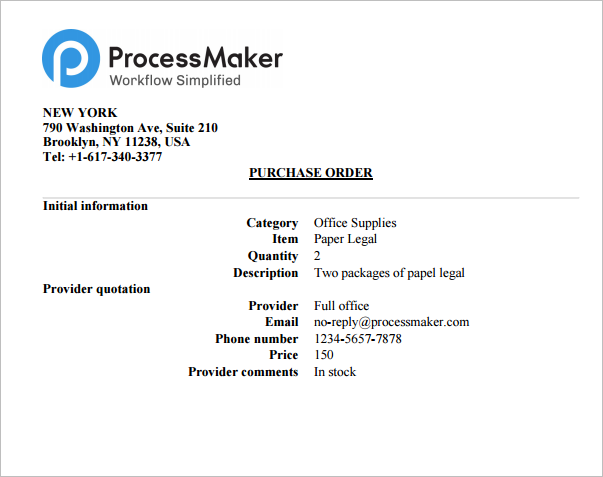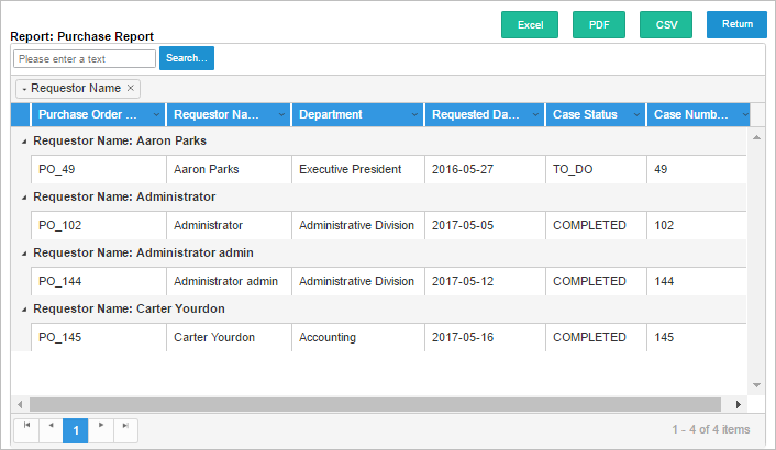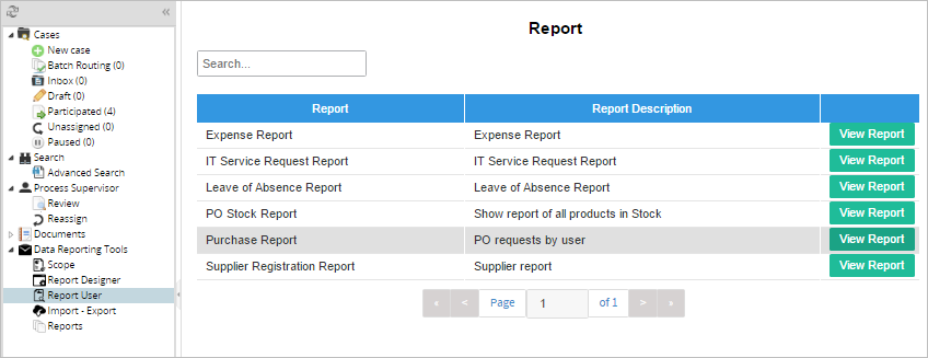 The Purchase Report shows all requests that have been completed or are in progress. This report is generated using ProcessMaker's Data Reporting Tools plugin.
