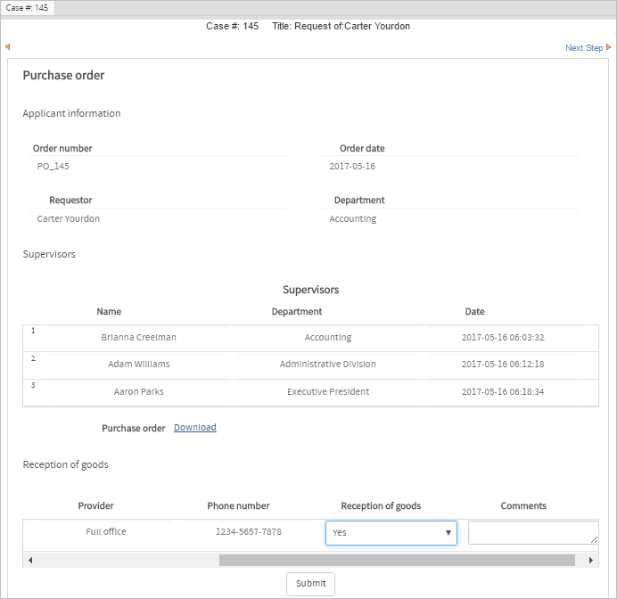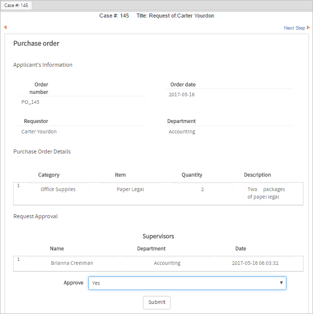 Log in as Brianna and open the case sent by Carter in the task Approve Order. The form that opens displays the information about the request, and the supervisor can approved or reject the request in the yes/no field named "Approve".