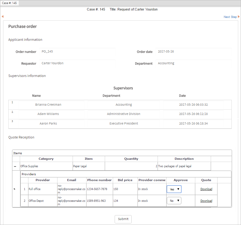 The quotes will be sent to the manager and the manager will evaluate the quotes and select the best supplier. The case will be in a paused state until information from all suppliers is received, and then at this point the manager can choose to select a supplier. Once a supplier is selected, a purchase order will be generated and sent. In the case that the providers do not send the pricing information or a suitable quote is not received, the manager can terminate the request.