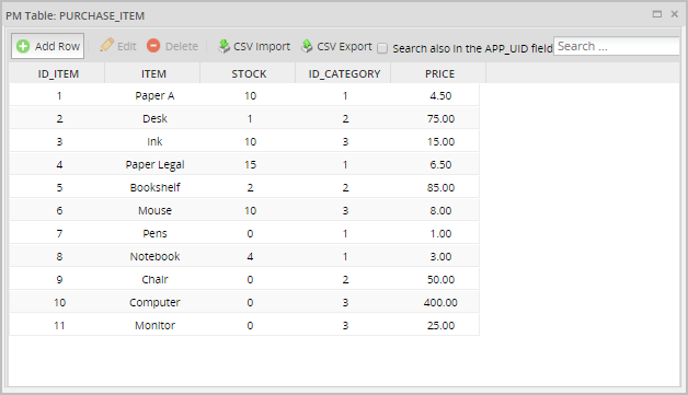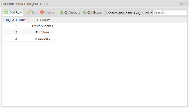 Resources: By default, there are three categories to make a request in: Office Supplies, Furniture and IT Supplies, which are located in the Category column of the request form. In each category, there are two possible items to be requested as well (For Office Supplies: Notebook, Paper A, Paper Legal and Pens; for Furniture: Bookshelf, Chair and Desk, and for IT Supplies: Computer, Ink, Monitor and Mouse) in the Item column. However, it is possible to add categories and items and customize them by adding or updating rows inside the PM tables PURCHASE_CATEGORY and PURCHASE_ITEMS.