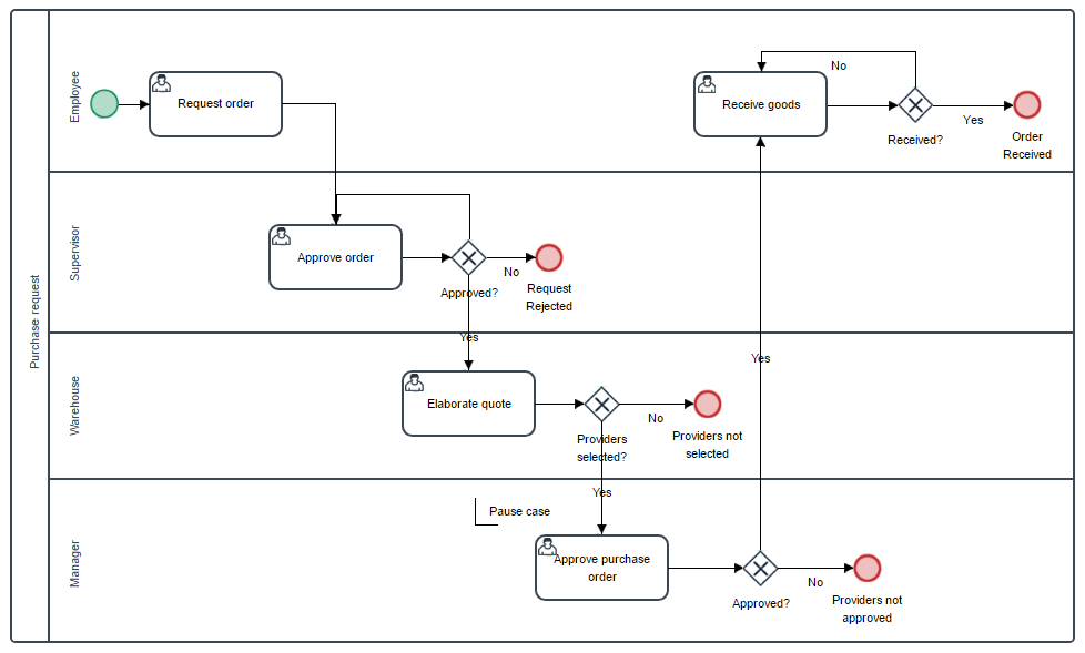 The supervisor's answer is evaluated inside an exclusive gateway, where if the request is rejected (Approve = No) the process finishes. If the request is approved (Approve = Yes), the case is sent to a user belonging to the warehouse group using the cyclical assignment method. In the example, Brianna approved the request and it was sent to Dylan.