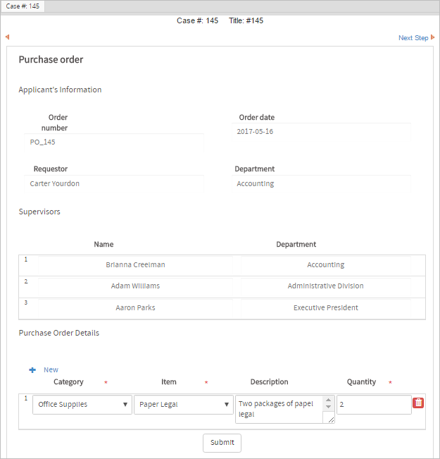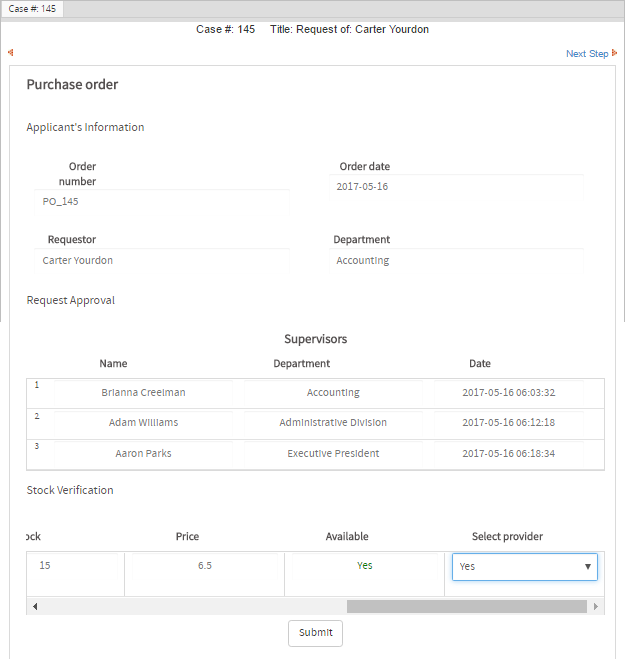 The first task Request Order, initiates the case with a Dynaform that solicits information about the applicant, the employee name, date and the employee's department in the first section. In the second section, the supervisors of each department are listed. In the third section, the details about the purchase request must be filled in. For example, if Carter is requesting paper: