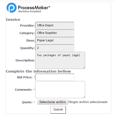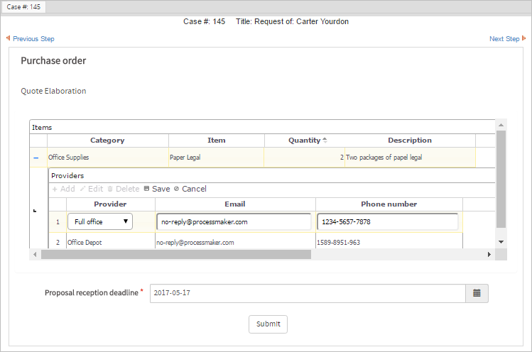 This Dynaform uses a third party library called "JQgrid". To get all the information from the case, it uses a plugin called "ProcessMakerBundle." This plugin has all the Jquery third party libraries that are required. The user should fill out the supplier information and add a deadline for receiving the proposal. Once the form is submitted, email notifications are sent to the selected providers.