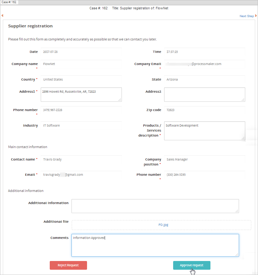 Log in as Brianna to review the request sent by Carter. Like the Dynaform in the previous task, the supplier's information will be displayed in read-only mode. The supervisor will review the information and decide if the request is approved or rejected. Note that the supervisor must add a comment to the Comments field before selecting an option.