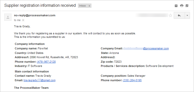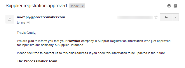 Finally, a notification is sent to the supplier's email address informing the supplier that the information provided has been entered into the company's database.