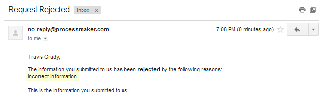 The case will be routed to the Add new information task where the assigned user must add or correct the information in the Dynaform using additional information provided by the supplier. If the supplier doesn't respond to the email and provide additional information, the user can reject the request and the case will finish, sending an email notification to the supplier.