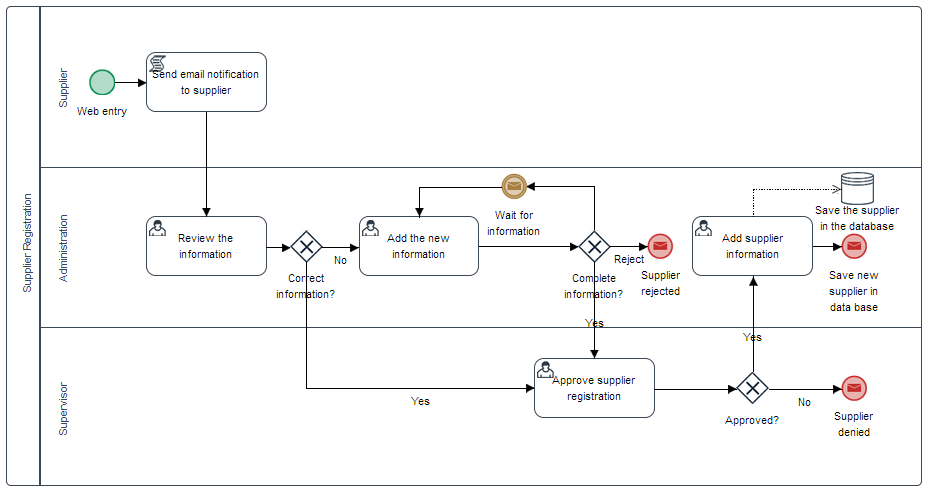 Supplier registration is a process that adds new providers to the company. The provider starts a new case by completing a form that can be accessed by any user without being logged in to ProcessMaker. Once the company receives the new provider's information, it is analyzed and verified by a member of the Administrative division. If the information is approved, the case is routed to the user's supervisor to make sure that the new supplier will meet the company's requirements. Once the case approved, an email is sent to the supplier and the information is saved to a PM table.