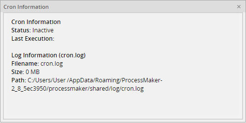 - View information: Shows the following information about cron: Status, Last Execution and Log Information, which specifies the folder where the cron.log file is located.