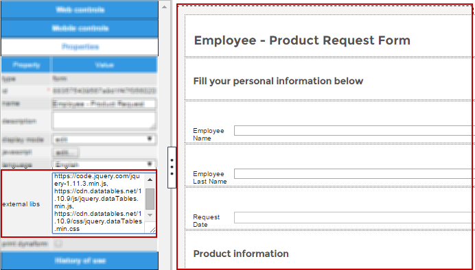 This property allows users to add external library files to the Dynaform to add additional functionalities, content or styles to the Dynaform. This property is useful to add JavaScript or CSS (Cascading Style Sheets) files to the Dynaform, so they can be accessed by HTML code placed in a Panel's content property.