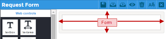 In the Dynaform designer, the main container of the form is represented by the light gray canvas where the rows are added and the design of the Dynaform is built. Forms inside the designer depend on properties that may define the entire behavior of the Dynaform. It is inside forms that JavaScript code and External Libraries can be added inside forms in order to enable extra functionality for the current Dynaform. Also, inside the properties of the form, the "Language" property allows selecting the translations of the form content, after uploading custom /po files to it. This functionality is fully explained at the following page: Dynaform Multi-language Support. Finally, the view mode of the form can affect the way elements will be displayed.