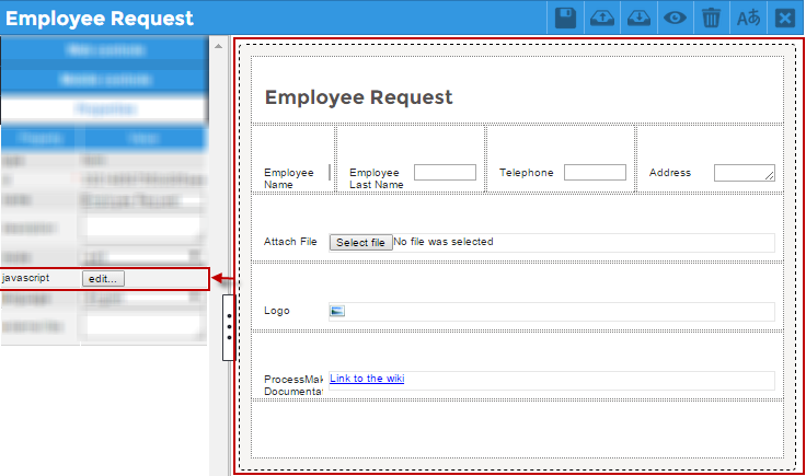 | JavaScript | Opens the JavaScript editor used to insert JavaScript code in the form. |