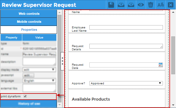 | Print Dynaform | Check this option to have the ability to print the Dynaform. This property also adds a printer icon at the top right side of the Dynaform when it is rendered. Available Version: Available from 3.0.1.7 |