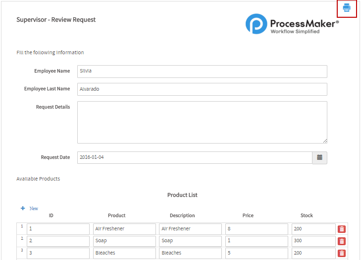 Click on this icon to print the form. All current content in the form will be printed, no matter how extensive the form is. The page header contains the current date at the top left corner, with the "PMDynaform" text in the center. The footer contains the URL address where it was printed from.