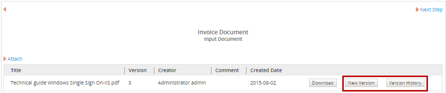 If versioning is enabled, new versions of an existing input document can be uploaded by clicking on the New Version button. To see a list of all the versions for an input document, click on its Version History button.