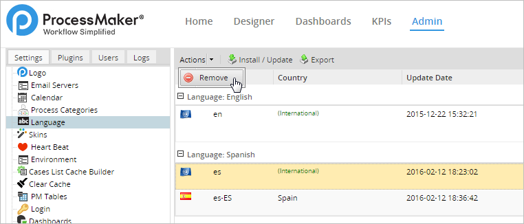 To delete a language from the ProcessMaker system, login into the ProcessMaker workspace where the language was originally installed. For example, if the language was originally installed in the "sales" workspace, then log into that workspace. Go to ADMIN > Settings > Language and select the language in the list by clicking on it and it will be highlighted as seen in the image below. Then, go to the "Actions" menu and select the "Remove" option.