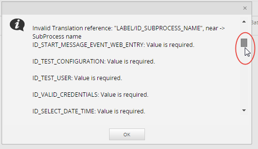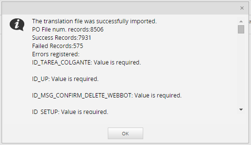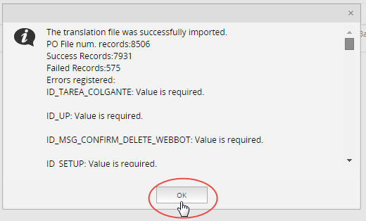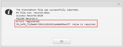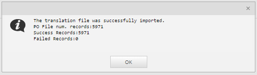 When done, a message box will indicate how many translation phrases were successfully imported (first image) and if not correct, how many of them have failed (second image).
