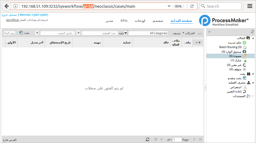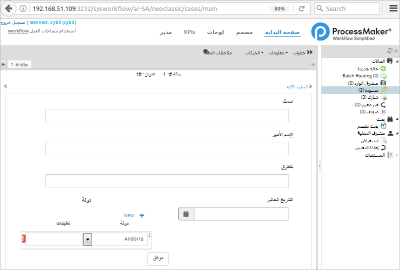 The content of the ProcessMaker layout will change to support the right-to-left orientation. This include entering, editing, and displaying the Dynaform's text. For example, if installing the translation file for Arabic, Processmaker will look like: