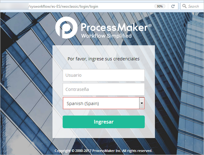 The default language is the language listed in the first place in the Language dropdown of the login screen. This language is also applied directly when the domain is entered (e.g. http://127.0.0.1:8081), the system reads the configuration and redirects to the ProcessMaker link with the default language (e.g. http://127.0.0.1:8081/sys/en/neoclassic/login/login).
