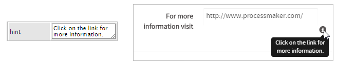 The following property is the "hint" property. Used to show help when the link control is rendered. Display the hint by hovering the pointer of the mouse over the ? icon. In this case the hint can be: "Click on the link for more information.".