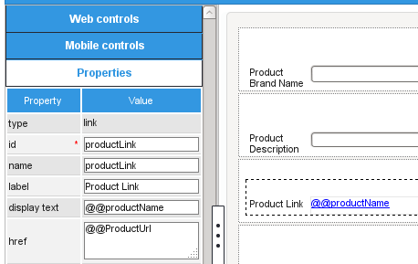 In this example, the @@productName variable is placed in the link's displayed text property and the @@productUrl variable is placed in the link's href property.