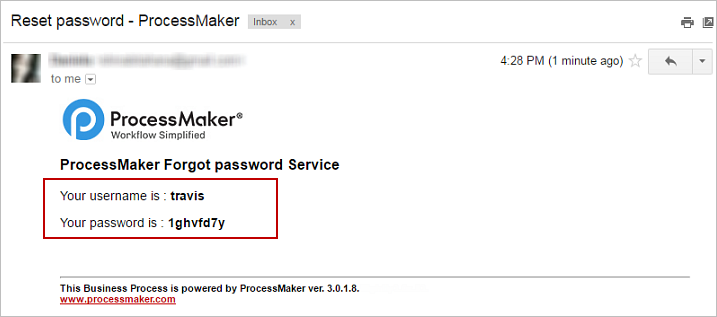 If the username and email address match the record of a ProcessMaker user, then an email will be sent to that user with a new randomly-generated password.