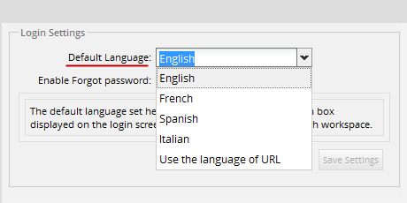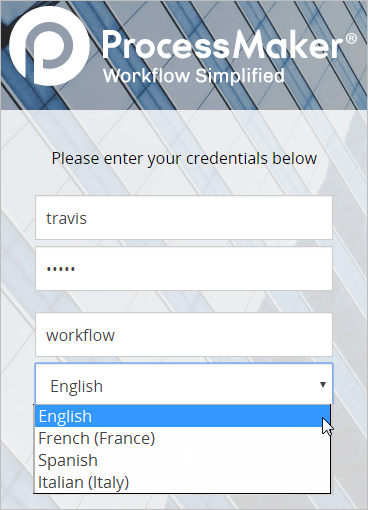 This option lets the user select the language by default. This language is the one selected by default in the login screen. ProcessMaker is available by default only in English, but translation files for additional languages can be installed. This configuration is set for each workspace.