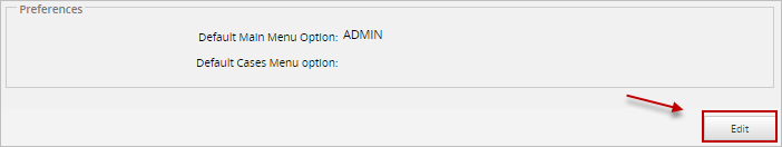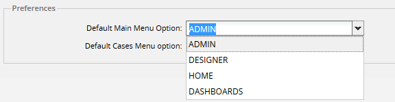 In the Preferences section, select which menu should be default menu in the Default Main Menu Option dropdown box. Under the HOME menu, the list of cases in the Inbox are displayed by default. To change which option is selected by default in the Cases sidebar, select from the Default Cases Menu Option dropdown box.