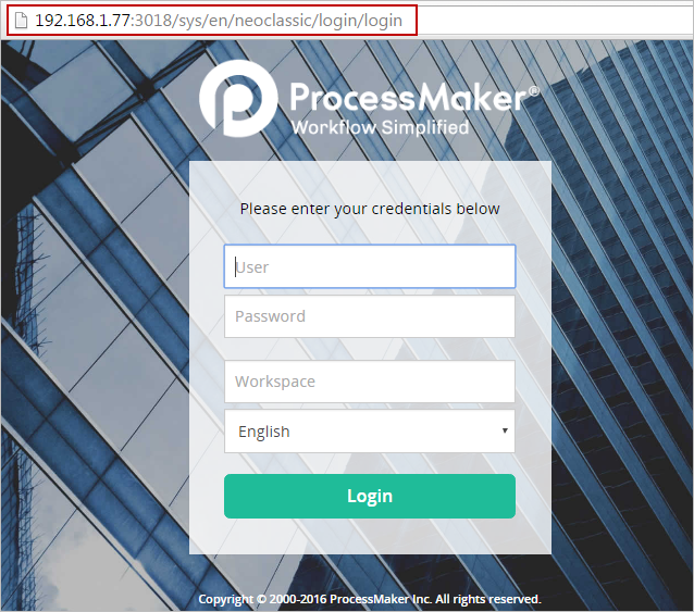 If only the IP address (or domain name) is included in the URL, the web browser will automatically redirect to the ProcessMaker login screen at: