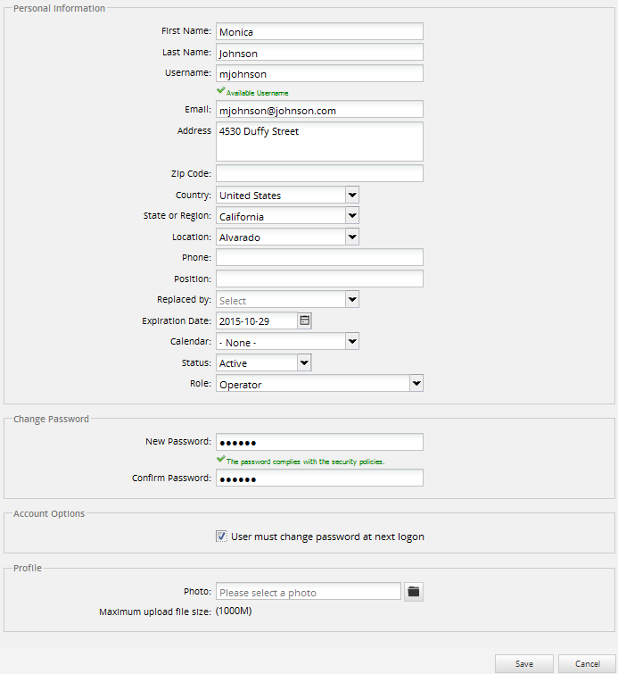 - Expiration date: The date when the user will no longer be allowed to log in to ProcessMaker. The expiration date helps protect an organization's data by preventing old users from accessing ProcessMaker.