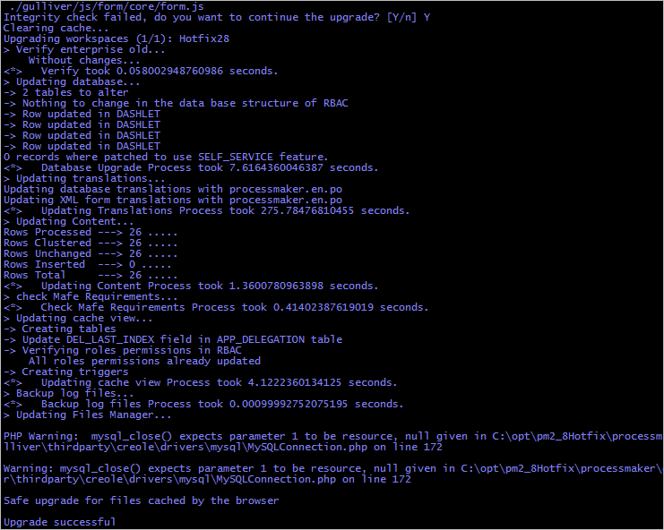 If the integrity check fails, the process will ask the user if he/she wants to continue the upgrade process. Answer "Y" to continue.
